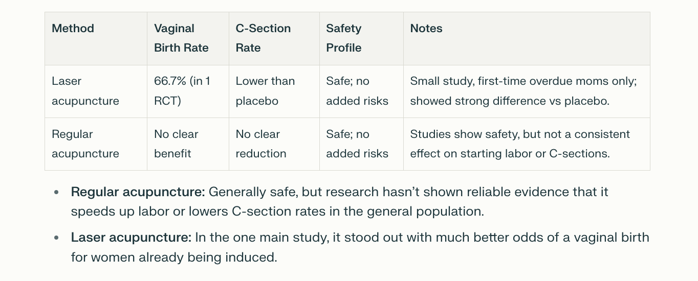 If you’re a first-time mom, overdue, and preparing for an induction, laser acupuncture could be a gentle, safe option to help your body move toward a vaginal delivery, with a lower chance of ending up with a cesarean. Regular acupuncture remains safe but hasn’t shown the same dramatic benefit.