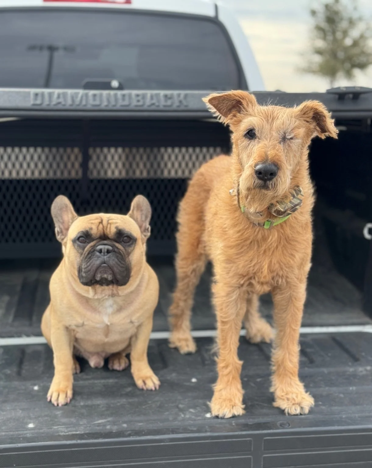 Samantha (or Sam, if you're family) is our 14-year-old Irish Terrier with a red coat that's slowly giving way to grey. She had eye surgery last year and still rules the house with that same, scrappy energy but now it’s pirate style. Her partner in crime is Dexter, our 4-year-old French Bulldog, is equal parts snorty charm and orthopedic and allergy chaos - tight hips, skin flare-ups, and a tendency to overdramatize minor inconveniences.