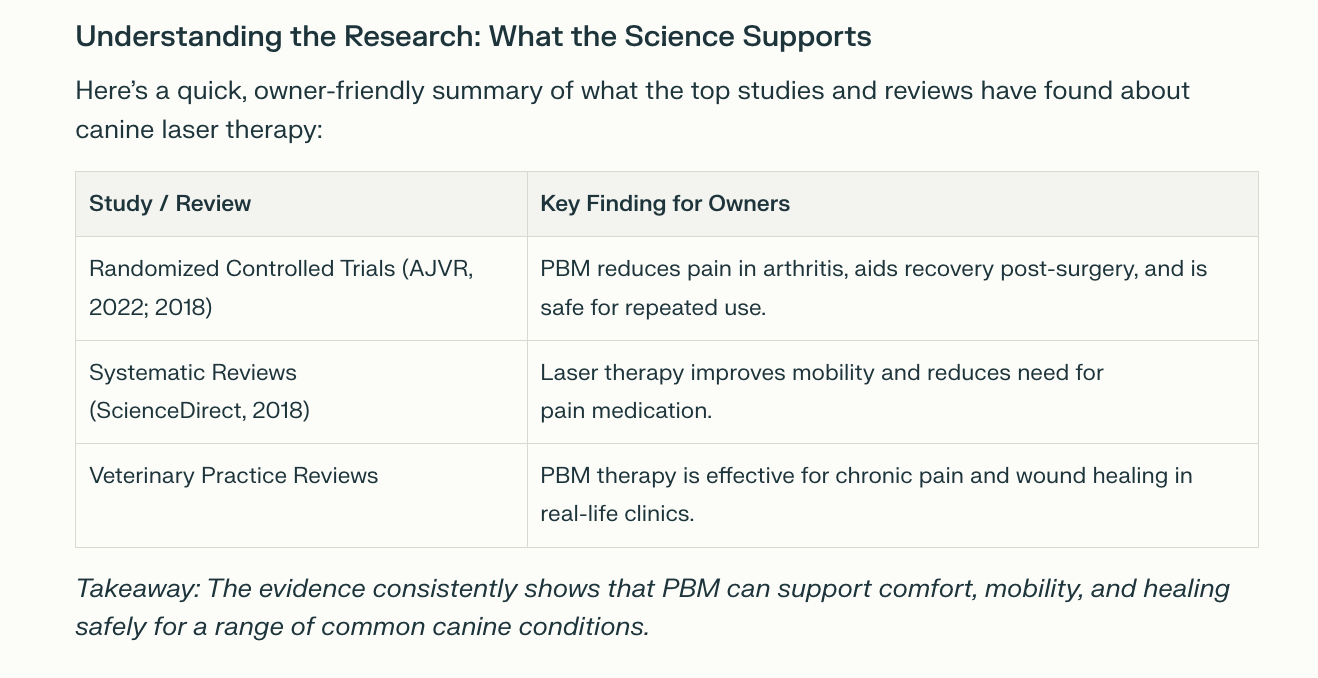 PBM is often best used alongside, not instead of, other necessary medical treatments. Laser therapy is an adjunct, not a replacement for veterinary diagnosis and care, always inform your primary vet when starting new therapies.