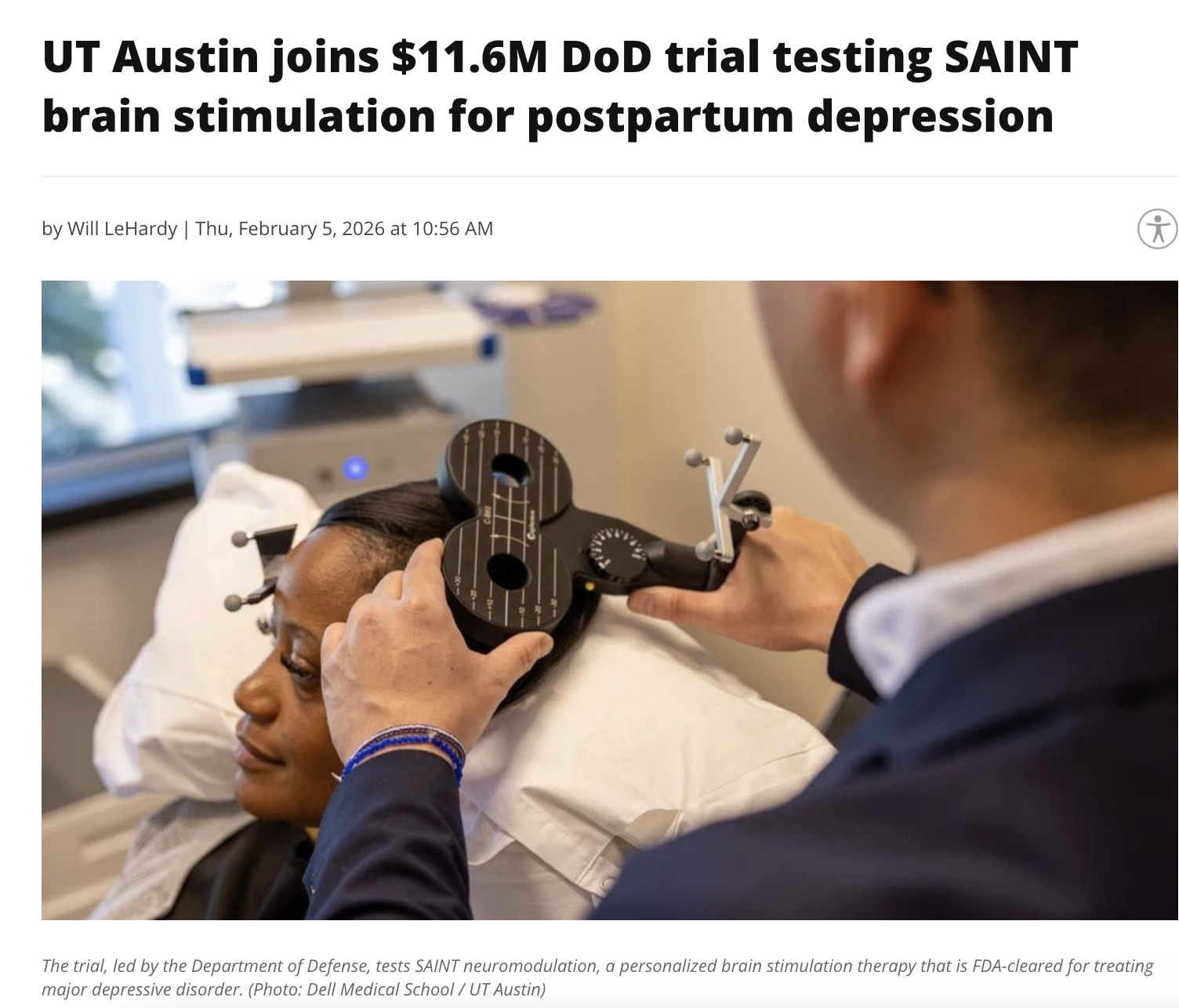 Right here in Austin, UT’s Dell Medical School has joined a major Department of Defense‑funded clinical trial testing an advanced, non‑drug brain stimulation called SAINT (Stanford Accelerated Intelligent Neuromodulation Therapy) for postpartum depression.