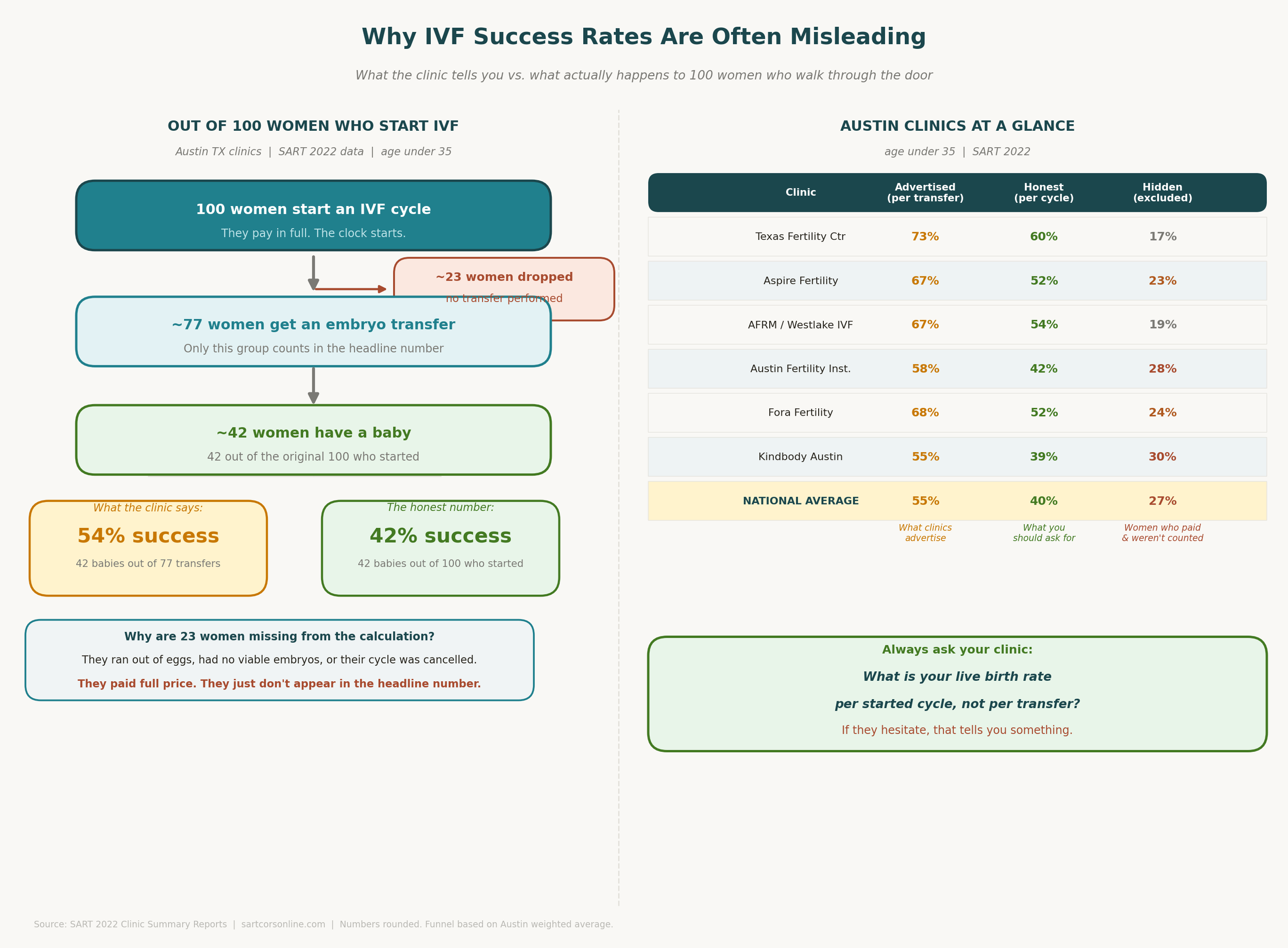 And I want you to really hear this: in Austin-area clinics, that same pattern holds. Advertised rates average 55 - 73% per transfer, but honest per-started-cycle rates fall to 39 - 60%. Up to 30% of patients are quietly excluded from the headline number before it ever reaches a brochure.